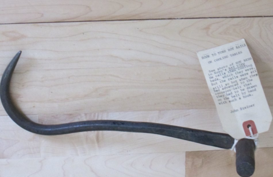 Hook used by ironworkers to move and turn hot iron rails on cooling beds.