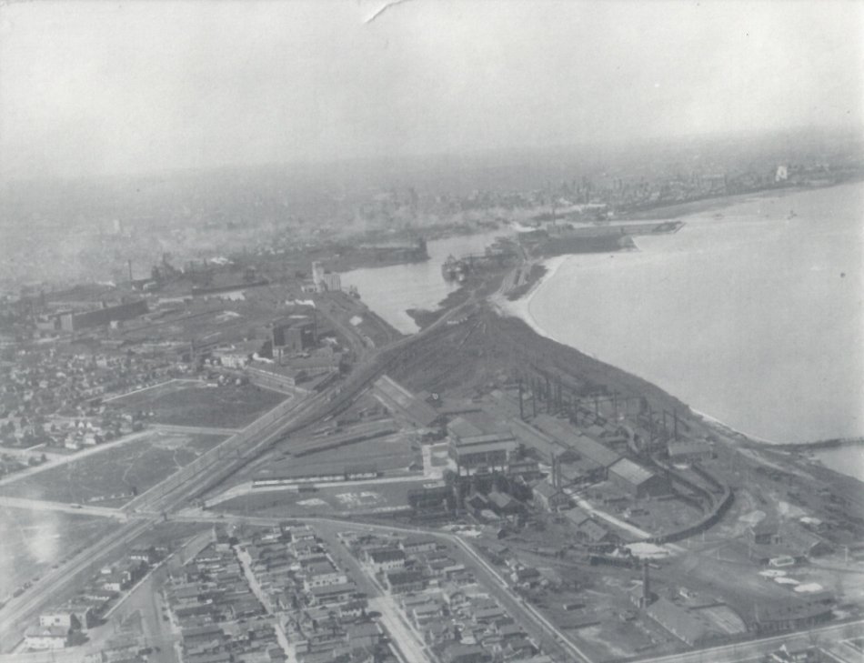 Photograph of aerial view of Bay View Rolling Mill site and Jones Island.